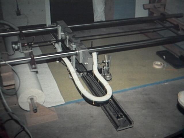 similar bargains to those I'd found in the surplus electronic equipment market. Over several months, and forays into many a warehouse, I found what I was after. In a dirty, machine-oil-stinking back-room, sat two 8 ft. long, 2" diam. hardened steel rods, with carriage and mating linear bearings-- all for $60. I had to replace one of the bearings ($100), but overall, it was a bargain. I found a scrapped 6 foot linear table in a different warehouse, and at long last had the main ingredients for a large-scale XY table. I purchased the most reasonable 6 ft. ball-screws/nuts I could find (new), and after considerable effort getting things mounted and aligned, had a robotic engraver