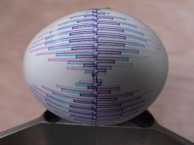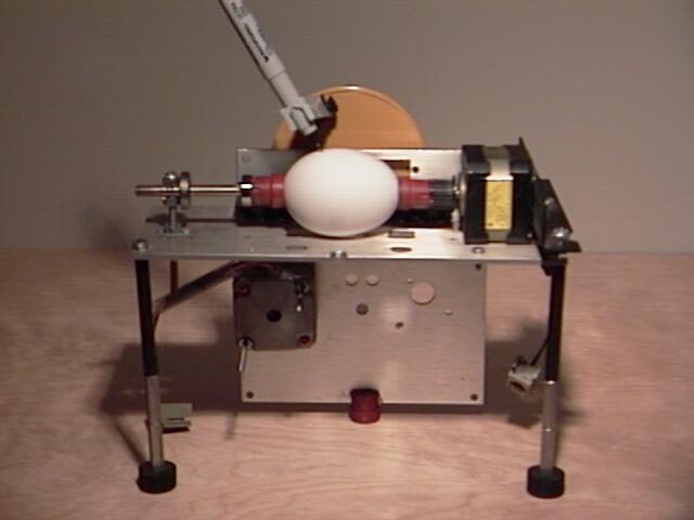 In April of 1990 I had just learned how to connect two stepper motors to an old PC and was pondering an application. Easter was approaching, and my kids' discussion of egg coloring prompted an idea: construction of an "egg-plotter" using the two motors in an X and Y configuration-- one to roll the egg along its long axis, the other to move a pen from "pole to pole." My construction skills were pretty shabby, but I managed to throw it together in an afternoon. After writing a simple BASIC routine, I sat back and observed the creation of my first piece of robotic art.