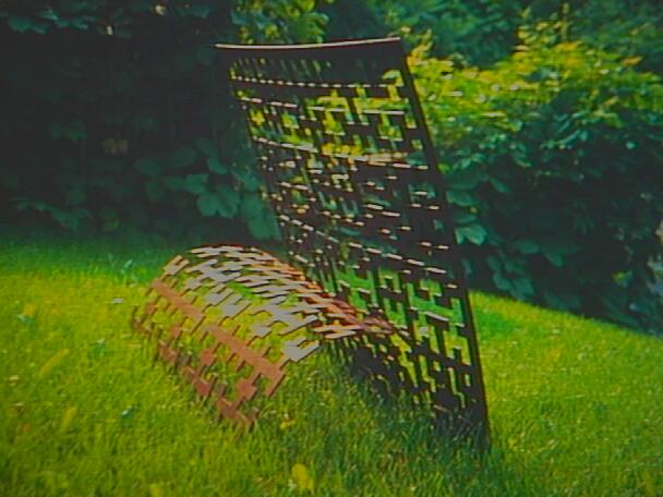 Sculpture created from a single steel plate, 30" square, utilizing a Hilbert curve (level 5) as the tool path. One continuous cut, 77 feet long. (1994).