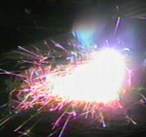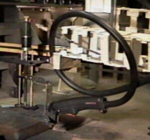 On the very day that the egg-plotter produced its first output, I realized that the exact same process could be used for laser cutting. Unfortunately, the cost of units with enough power to cut metal is over $100K. By chance, a contractor friend who was over for dinner noticed a steel sculpture that my wife and I had recently bought and said something about a "plasma cutter." He explained it's utility in cutting metals, using only compressed air and electricity-- and its relative affordability (small units start ~$500 new). Two years later (and after two semesters in welding class at Dunwoody Institute), I purchased this tool. I constructed another large-scale table dedicated to cutting in the summer of '94, and a year later, added the ability to cut cylinders. The images show the "business" end of this tool-- designed for hand held use, it resembles a pistol. Unlike oxy-acetylene cutting, plasma may be used to cut any metal. Because the tool is mounted and controlled remotely in this case, I am less exposed to the fumes, arc flash, and noise. Although industrial units can cut plates several inches in thickness, I am limited to ~1/2".